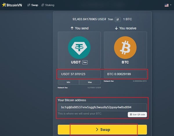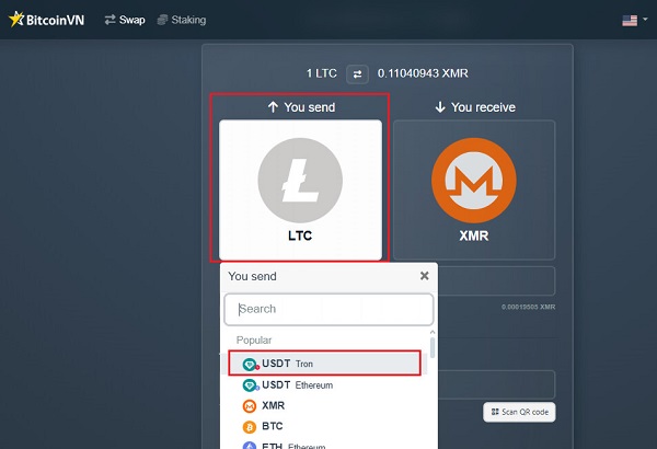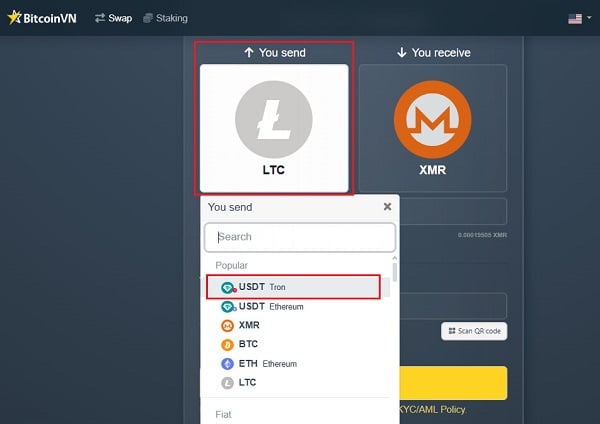 - Step 1: In the “You Send” section, select USDT. Please select the right chain for your USDT. If you hold USDT (TRC20) on Coinbase, choose USDT (Tron) on BitcoinVN.