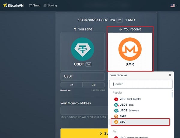- Step 1: In the “You Send” section, select USDT. Choose the correct network for your USDT. For example, if you have USDT (TRC20) on Coinbase, you must select USDT (Tron) on BitcoinVN.