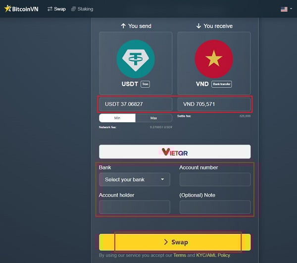- Step 3: Enter the amount of USDT you wish to cash out. The corresponding VND amount will be displayed automatically. Then, enter your bank transfer details and click “Swap” to submit your transaction request.