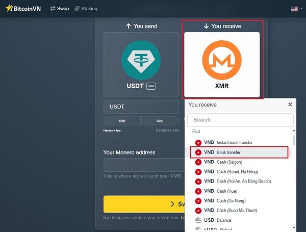 - Step 2: In the “You Receive” section, select VND Bank Transfer or VND instant transfer (which will settle generally within seconds). You can also choose to pick up cash at our offices in Ho Chi Minh City, Da Nang, or Hanoi (please check if our office locations are convenient for you). In this guide, we will focus on withdrawing to a Vietnamese Local Bank Account.