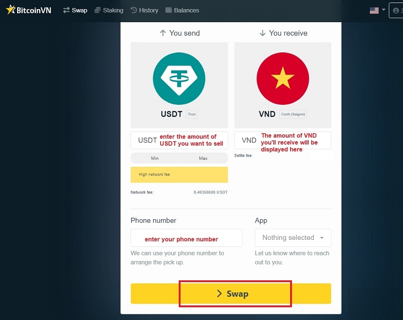 - Step 4: Enter the amount of money you want to sell and your phone number so we can contact you if needed, then click the “Swap” button.