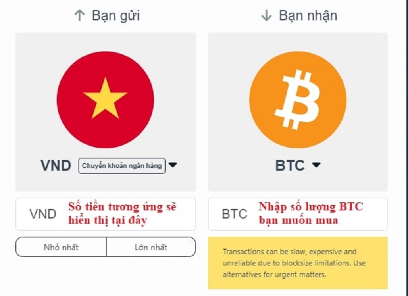 • Bước 4: Nhập số lượng BTC bạn muốn mua, số tiền tương ứng sẽ hiển thị dưới logo VND.