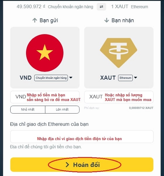 Bước 2: Nhập chọn số tiền mà bạn sẵn sàng bỏ ra đề mua XAUT hoặc nhập số lượng XAUT mà bạn muốn mua. Số lượng XAUT hoặc số tiền tương ứng sẽ hiển thị sau khi bạn nhập. Tiếp theo, điền địa chỉ ví để nhận tiền điện tử. Cuối cùng bấm hoán đổi để thực hiện giao dịch.