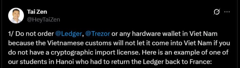Năm 2023, một sinh viên tại Hà Nội đã chia sẻ trải nghiệm thật sau khi đặt mua ví Ledger Nano X trực tiếp từ Pháp. Khi kiện hàng về đến Việt Nam, hải quan đã tạm giữ thiết bị với lý do chưa có giấy phép nhập khẩu sản phẩm mật mã dân sự.