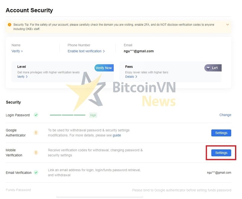 - Bước 4: Ngoài Google Authenticator, các bạn có thể dùng số điện thoại của mình để làm bảo mật 2FA trên sàn OKX. Các bạn nhấn vào nút “Settings” ở mục Mobile Verification
