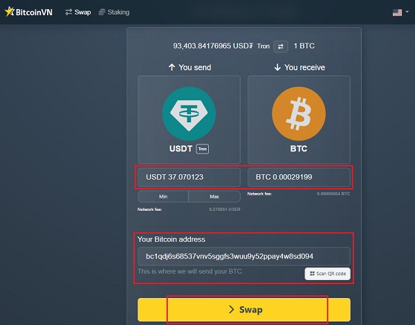 - Step 3: Enter the amount of USDT you want to spend or the amount of Bitcoin you wish to buy. The corresponding amount will automatically be displayed. Next, enter your recipient wallet address and click “Swap” to submit your transaction request.