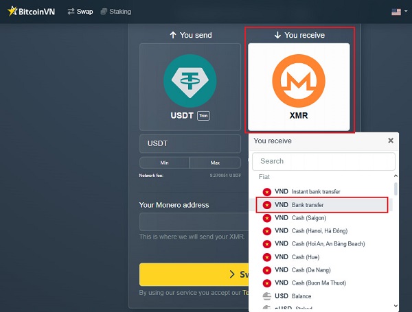 - Step 1: In the “You Send” section, select USDT. Please select the right chain for your USDT. If you hold USDT (TRC20) on Coinbase, choose USDT (Tron) on BitcoinVN.