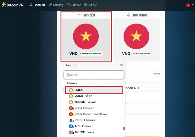 • Bước 2: Tại “bạn gửi” chọn DOGE.