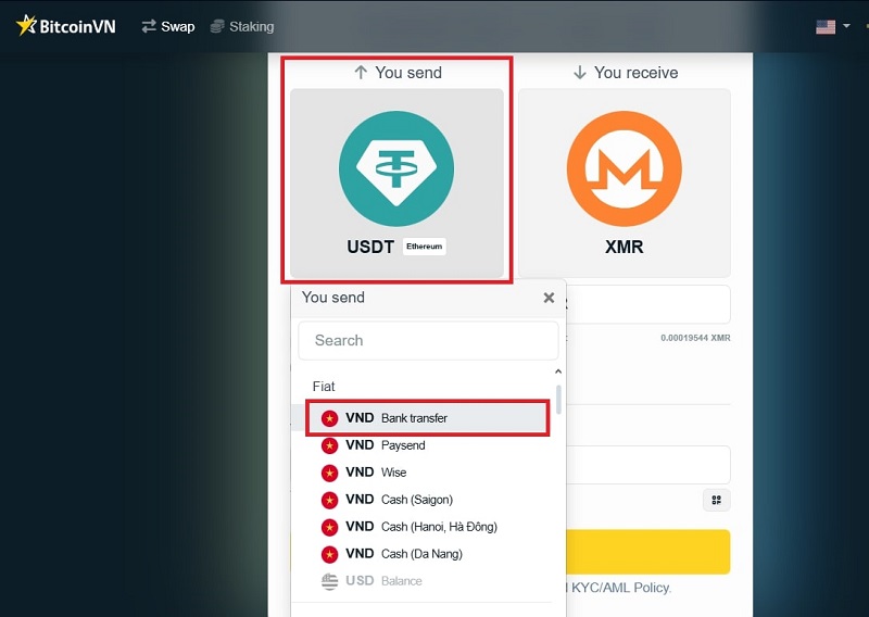 • Step 2: In the “You send” field, choose the type of asset you want to pay with. For this guide, we’ll use VND as an example.