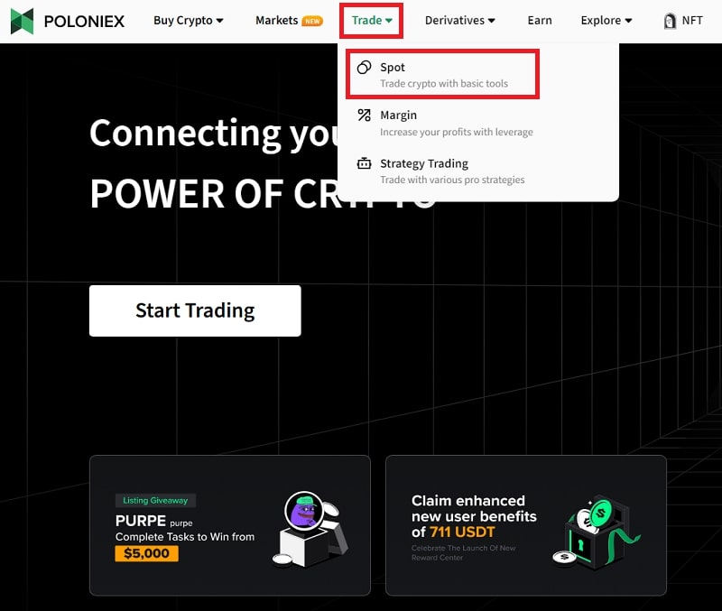 - Bước 1: Bấm vào “Trade” và chọn “Spot”.