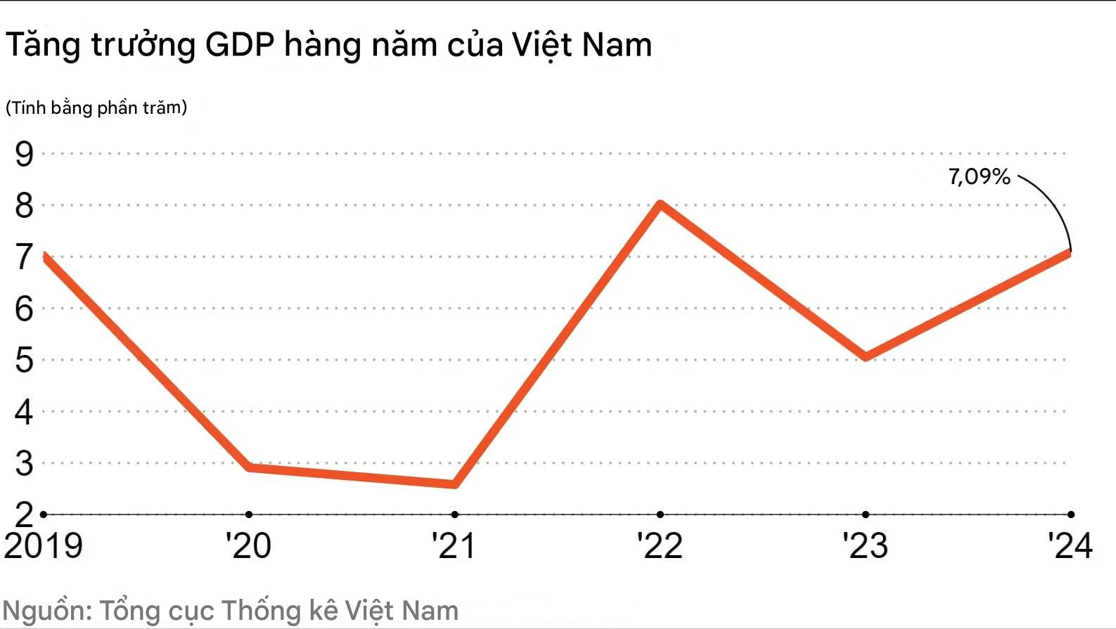 Nền kinh tế Việt Nam đã có bước phát triển đột phá trong những năm gần đây với tốc độ tăng trưởng GDP trung bình hàng năm khoảng 6,2% (từ năm 2000 – 2024). Riêng trong năm 2024, GDP tăng 7,09%, vượt chỉ tiêu 7,0% của Chính phủ. Đà tăng trưởng mạnh mẽ này giúp Việt Nam Việt Nam lọt top các nền kinh tế tăng trưởng nhanh nhất thế giới. Dự báo năm 2023, “đất nước hình chữ S” sẽ lọt vào top 30 toàn cầu về tốc độ tăng trưởng thương mại và mức tăng tuyệt đối về khối lượng giao dịch.