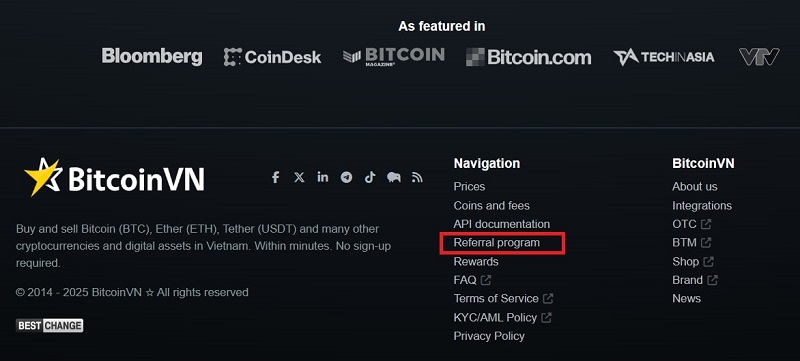 - Step 1: Visit the BitcoinVN website and scroll down to the bottom of the page. Select “Referral program”
