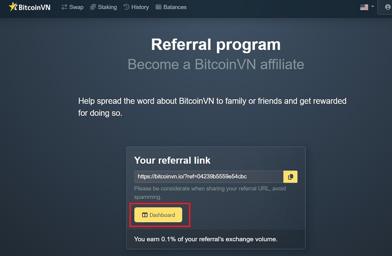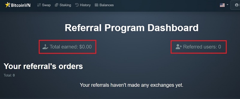 - Total earned: the total amount you’ve earned through the BitcoinVN referral program.