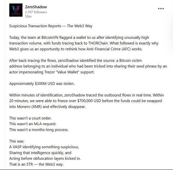 The zeroShadow team also confirmed that this is how Suspicious Transaction Reports (STR) work in the crypto era: identify, share, and act before the assets disappear.