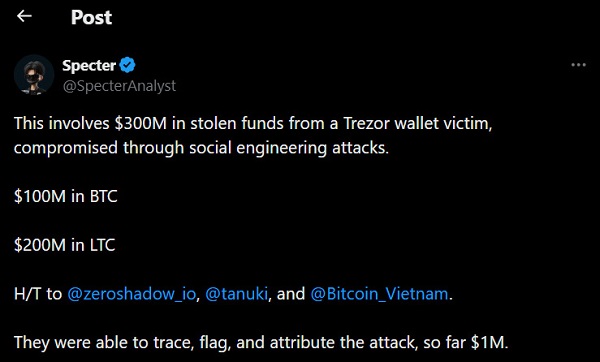 $300 Million stolen – This staggering figure is the result of one of the largest social engineering attacks to date targeting a Trezor wallet user. In a recent collaborative investigation, BitcoinVN and its partners at leading Web3 Security & Crisis Response firm zeroShadow uncovered this massive cryptocurrency heist, which included $100M in BTC and $200M in LTC.