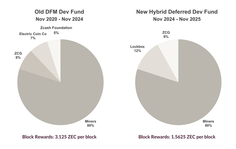 Under the new model, the Development Fund has been replaced with a 12% allocation to a “lockbox”, a reserve fund that will accumulate until the community reaches consensus on a decentralized disbursement mechanism. The ZCG continues to receive an 8% allocation for an additional year to fund community initiatives through grants.