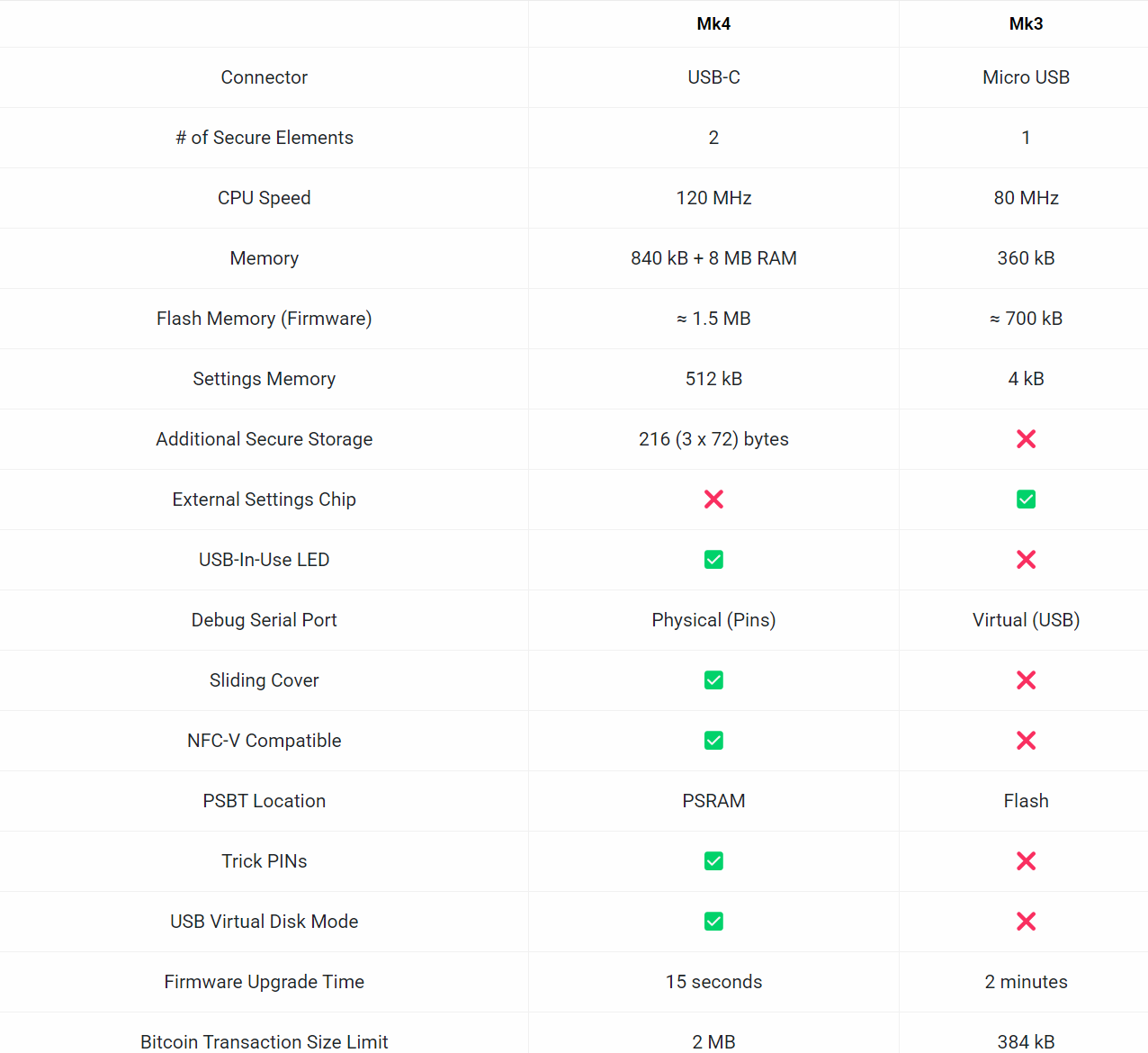 A full technical breakdown of the Coldcard Mk4 vs Coldcard Mk3 can be found below.