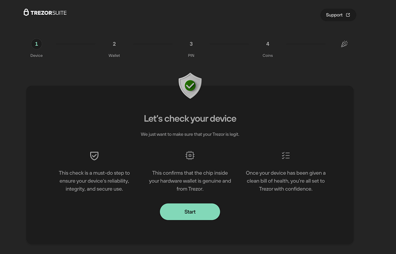 We’ve introduced this authentication check on Trezor Safe 3 to instill absolute confidence that you are using a genuine device, thus safeguarding your coins and tokens.