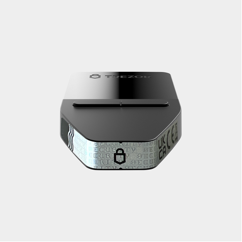 - Trezor Safe 3 device with a tamper-evident holographic seal over the connector (the Trezor Safe 3 packaging does not have a seal)